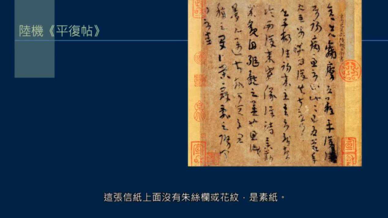 古时候的信纸,大约都是一尺高,长短有所不同。王羲之没有真迹留存至今,后代钩摹本不是原来的信纸。现在可见最早写在纸上的信,有西晋陆机的《平复帖》,