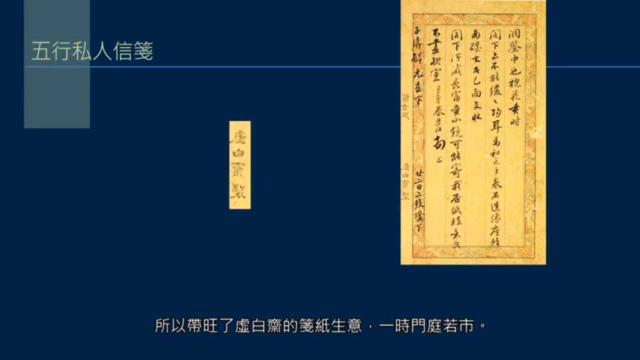 当时全国生产笺纸的店极多,虚白斋在杭州青云街,老板姓许。因为名士梁同书写信,非虚白斋笺纸不书,所以带旺了虚白斋的笺纸生意,一时门庭若市。
