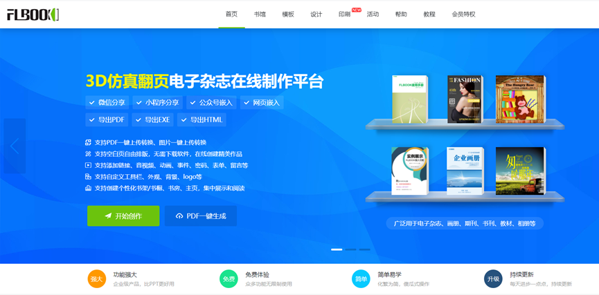 FLBOOK是一款不需要下载安装任何软件,只需一个网址,就能在线制作出3D仿真翻页电子杂志的效果,并且支持微信分享、小程序分享、导出PDF等,非常方便。另外平台设有书馆、超多精品模板、支持一键下单印刷,操作简单,帮你轻松完成工作。