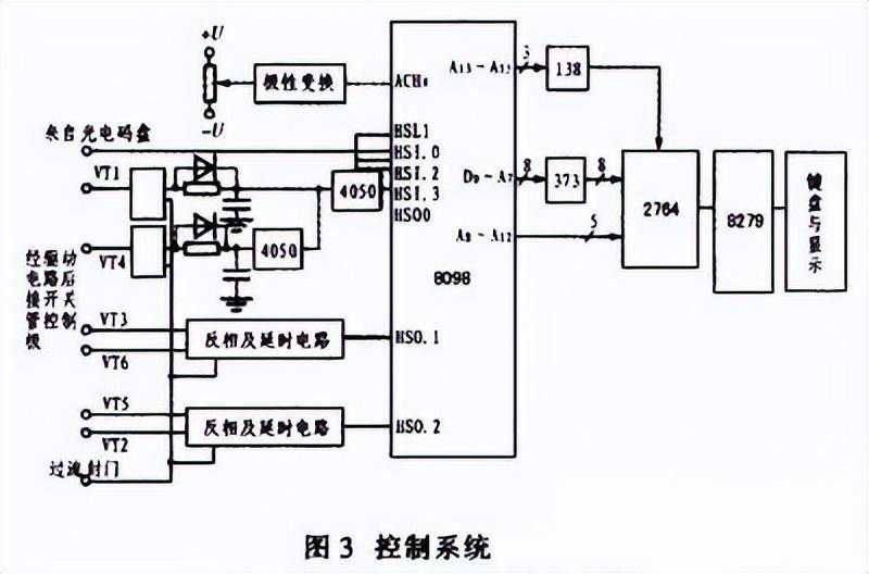 控制系统由8098单片机、地址锁存器74LS373、外部8KEPROM2764、用于扩展输入/输出接口芯片8279、键盘和显示器、地址译码器74LS138和SPWM波的反相及延时电路等组成。其中8098的最小系统完成SPWM的生成、M/T测速及闭环控制,并在最小系统的基础上利用8279扩展了键盘/显示电路,完成命令/数字键的输入及有关数据的输出显示。
