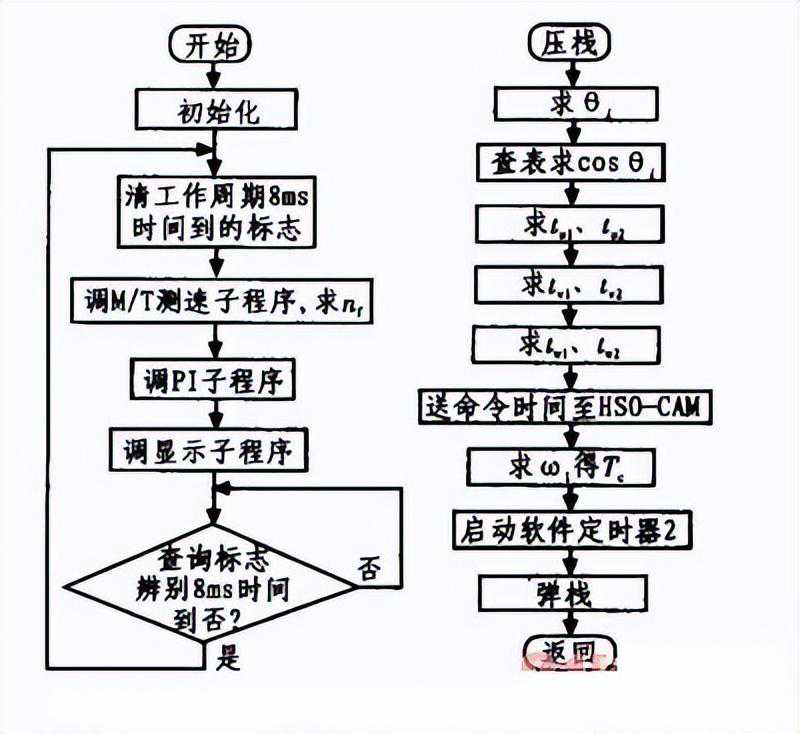 8098微机控制的SPWM变频调速系统的软件程序包括主程序和M/T测速、转差及频率运算、键盘显示等子程序。文中主要设计了主程序和SPWM波生成的中断服务程序框图,如图4所示,其他程序框图请读者查阅相关的参考书籍。