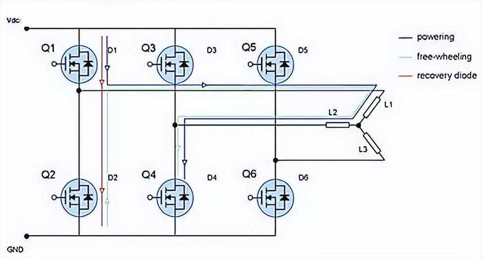当MOSFETQ1导通时,二极管D2被反向偏置,N区的少数载流子进入P+体区,反之亦然。这种快速转移导致大量的电流流经二极管,从N-epi到P+区,即从漏极到源极。电感L1对于流经Q2和Q1的尖峰电流表现出高阻抗。Q1表现出额外的电流尖峰,增加了在导通期间的开关损耗。