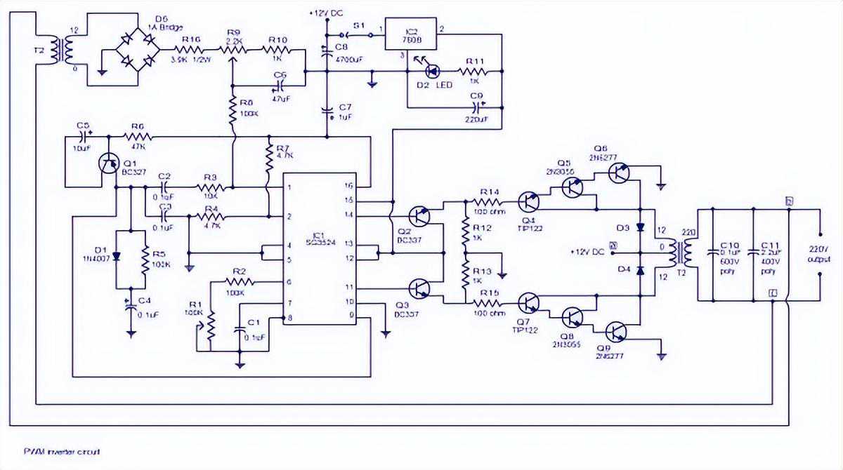因此诱导变压器二次电压(由于电磁感应),这个电压220V输出波形的上半周期。在此期间,11脚低,其成功的阶段将处于非活动状态。当IC引脚11云高的第三季度结果Q7的获取和交换,Q8和Q9将被打开。从+12V电源通过变压器的初级下半部和汇到地面通过晶体管的Q7,Q8,Q9,以及由此产生的电压,在T2次级诱导有助于的下半部周期(标签上标明)电流流220V输出波形。