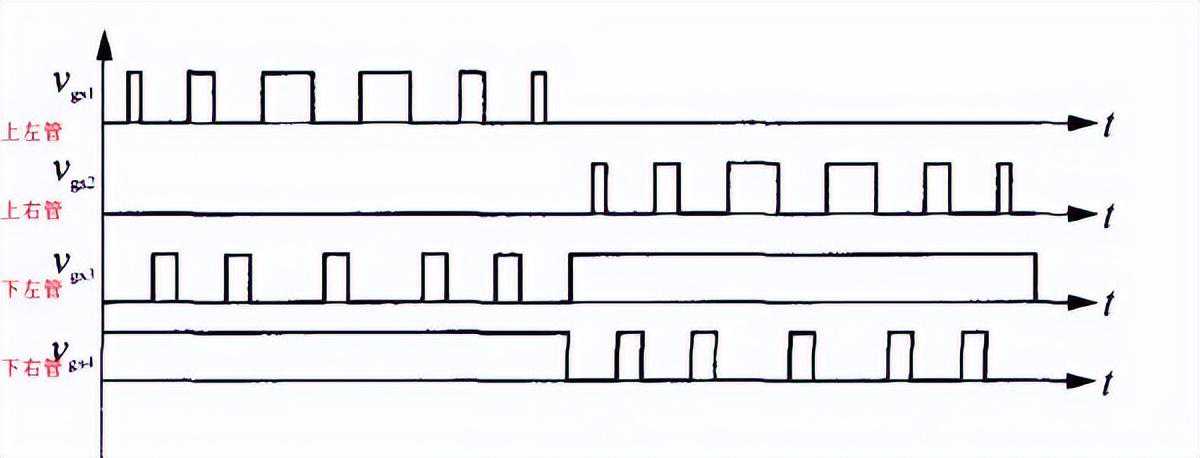 要说的是:现在的用单片机做的SPWM芯片,脉冲输出口一般只用二个口,分别输出二路极性相反的SPWM脉冲波,以单极性调制方式为例,送到H桥4个管子栅极的波形要求是如下图所示的。而要得到这四路波形,还要在芯片和H桥之间加入很复杂的时序电路和死区时间生成电路。单说这个时序电路,因其逻辑关系错综复杂,对于一般人看来,无所适从,除非是设计者本人,其他人是很难弄清楚其中的工作原理和时序关系的。