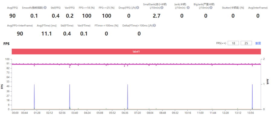 首先是《王者荣耀》,游戏设置为超高帧率、超高分辨率、高清画质,通过PerfDog来进行游戏数据检测,在游戏过程中帧率表现非常稳定,是一条直线状态,一局游戏结束平均帧率为90FPS。