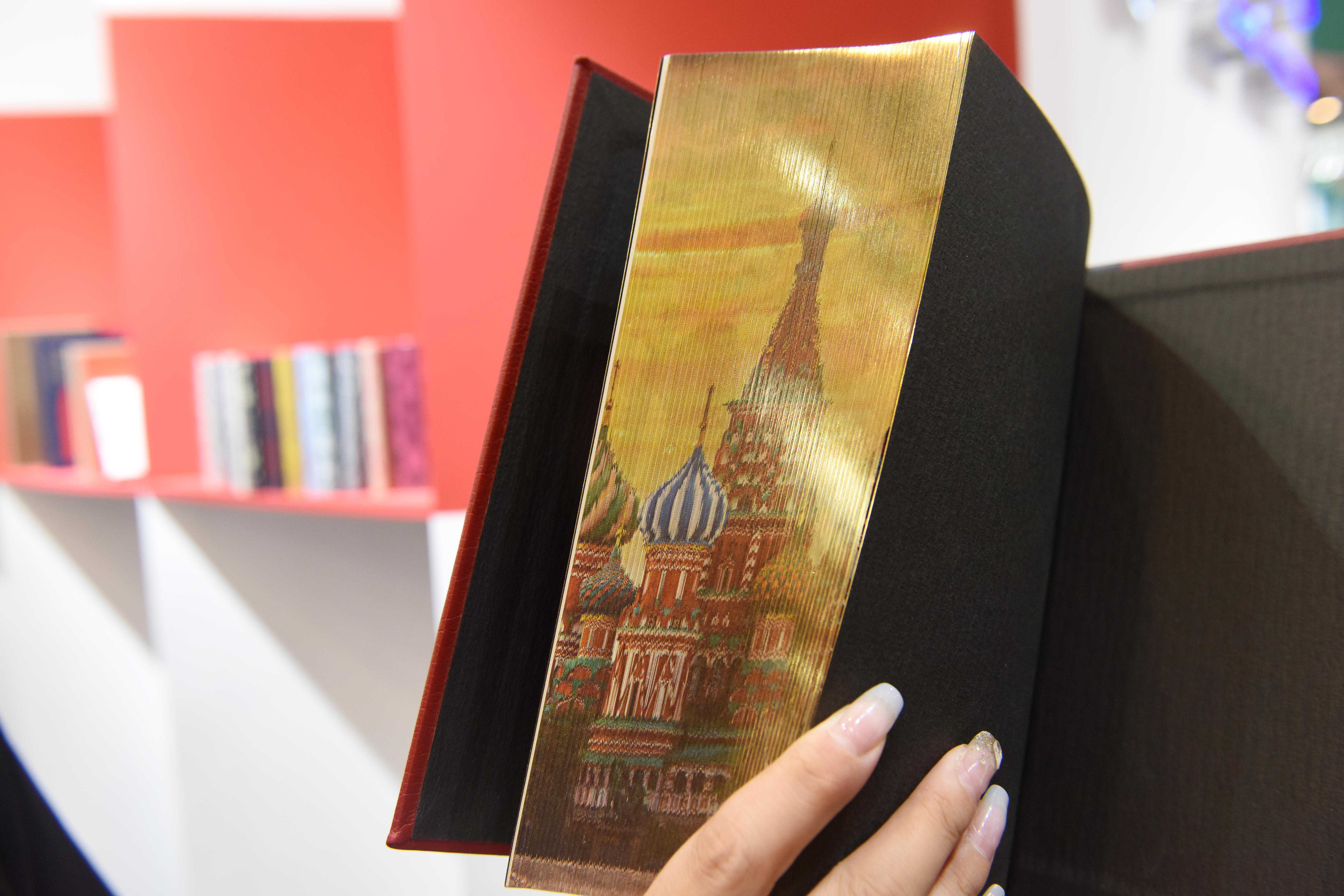 厚厚的世界文学名著《战胜与和平》,书口为纯金色,往左翻出现了莫斯科红场的图案,往右翻则显出俄罗斯贵族们的盛大舞会,这是爱德在书籍装帧上使用的“双面隐形图文印刷技术”。刘磊介绍,该公司应用的激光雕刻加喷色、三边彩色UV印刷等一系列先进技术,使得装帧设计展现出令人眼花缭乱的个性特色,《尤利西斯》书口上作者“乔伊斯”的签名,中国书协主席孙晓云《书法有法》三侧书口上立体的祥云、仙鹤等中国元素,《约翰·克里斯朵夫》书脊上的雕版印刷插图……都说书中未必有“颜如玉”,但应用了先进印刷技艺的书籍,本身就幻化为“颜如玉”,成为读者爱不释手的艺术品和收藏品。