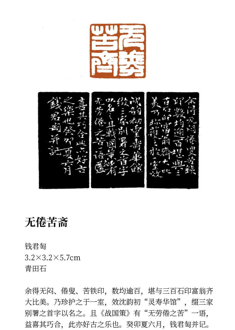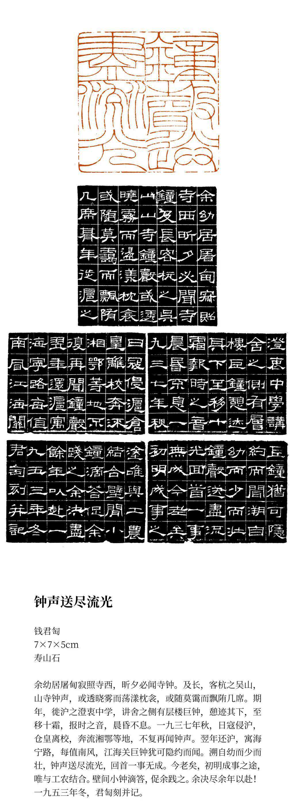 钱君匋精鉴赏、富收藏,又是一位多才多艺的艺术家,于书籍装帧、音乐、诗文、篆刻、书法和绘画等方面均有杰出成就。早在上世纪二三十年代,就为鲁迅、茅盾、郁达夫等许多著名作家的作品设计封面,有“钱封面”之美誉。1938年创办万叶书店,为我国现代出版事业作出了重要贡献,也是新中国音乐出版事业的奠基人之一。钱君匋一生致力于书画印创作,其作品集诗书画印为一体,享誉海内外。就书法而言,其真草篆隶俱佳,尤以质朴灵动的“钱体隶书”独步书坛;于绘画方面,他上溯明清,传承“海派”,笔墨简洁,苍劲老辣,意境高古;其篆刻创作,追宗秦汉玺印,下取晚清诸家精髓,作品见刀、见笔、见墨,老辣俊爽,风格独具。著作出版有《春梦痕》《水晶座》《冰壶墨韵》《君匋书籍装帧艺术选》《长征印谱》《鲁迅印谱》《钱君匋精品印选》《钱君匋书画篆刻精品集》《钱君匋论艺》等等。