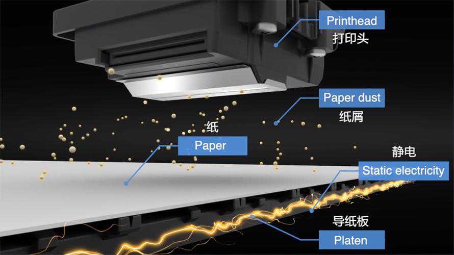 打印头是否正常工作也是关系到打印质量的重要一环,爱普生在打印头上做了进一步的优化。相信喷头堵塞是不少用户最为烦躁的问题。传统的喷墨打印机容易由于静电引发纸屑飘散,从而导致打印头沾染纸屑而堵塞,而爱普生采用了一块导电塑料板将纸屑吸附在塑料板上,从而解决了这一难题。只要关闭打印机后,导电塑料板就会开始工作。即便是将打印机的插头拔了,它依然会继续纸屑的吸附工作。