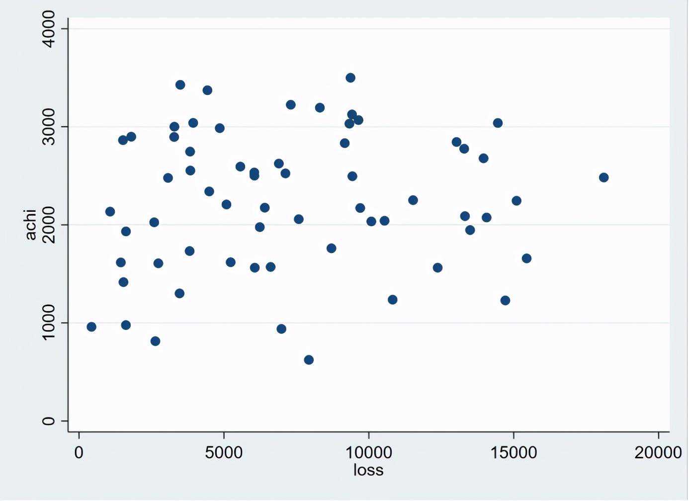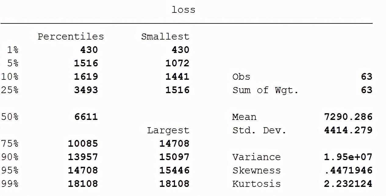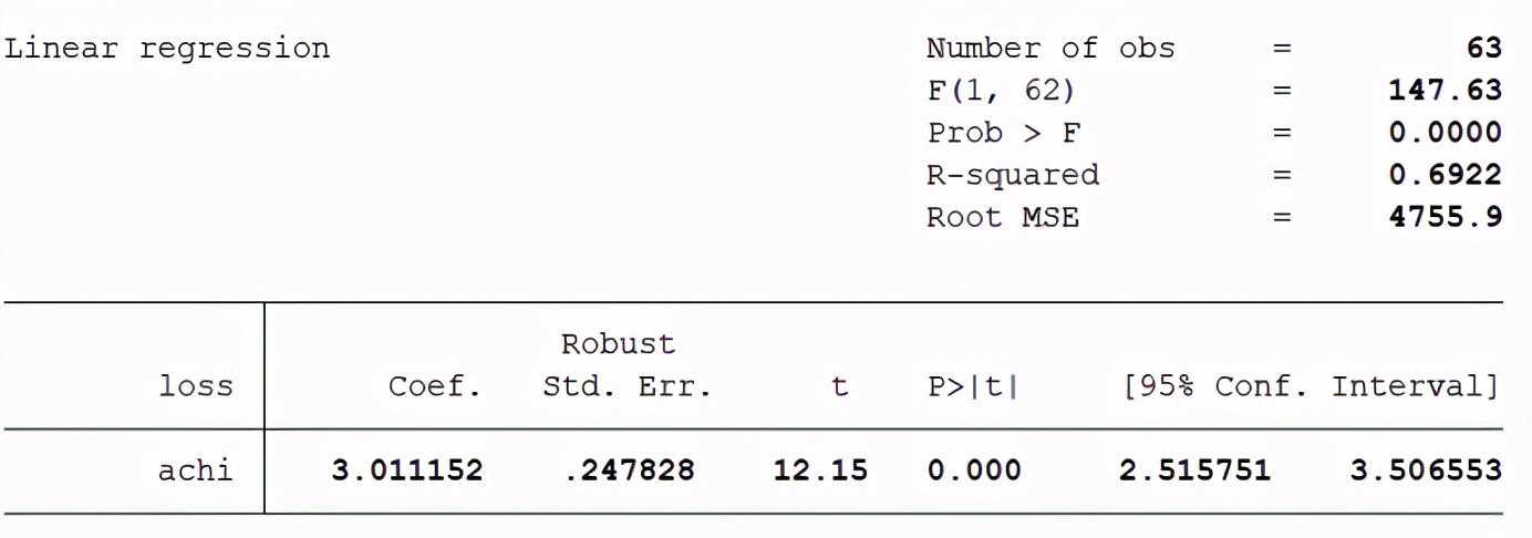 结果显示模型P值显著为0,即在0.01置信水平下显著,换言之即差异性极显著。achi的P值也显著为0,说明achi与loss关系显著。achi的系数为3.011,即每获得1点战功,就要付出3.011阵亡士兵的代价。