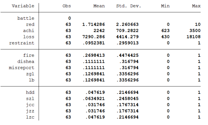 battle:战局。其中四回合内胜用文本标签4代表,八回合内胜取用文本标签8代表,八回合战平用文本标签0代表,八回合内败取用文本标签-8代表,四回合内败用文本标签-4代表。(由于象兵的特殊机制,本期采用多值并列模型mlogit进行分析。)red:敌方红度。记录敌方红度。红度计算方法为敌方三将红度的简单加和,最低为0,最高为15。