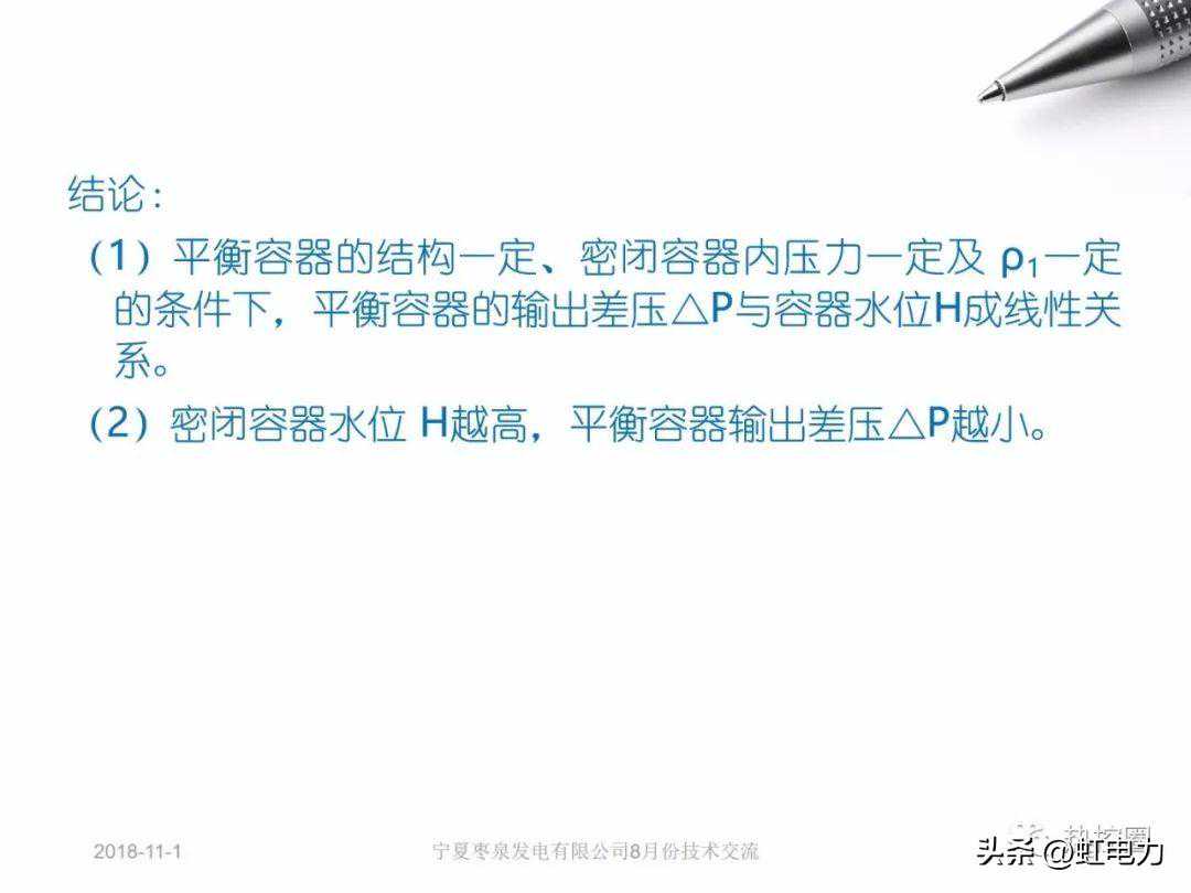1、精确度高,不受汽包内水欠饱和以及外置平衡容器参比水柱温度变化的影响,从公式可以看出变送器所测得的差压值为汽段参比水柱(饱和水)和相同高度的饱和汽静压之差,这一点与以往的任何一种外置式平衡容器不同,而采用外置式平衡容器测量汽包水位不仅受平衡容器下参比水柱温度变化的影响,而且由于补偿公式是假定汽包内水是饱和状态下推算出来,而实际上汽包内的水是欠饱和的,而且随着负荷变化欠饱和度也是变化的,由此可见,采用内装平衡容器的测量精确度远比外置式平衡容器要高。