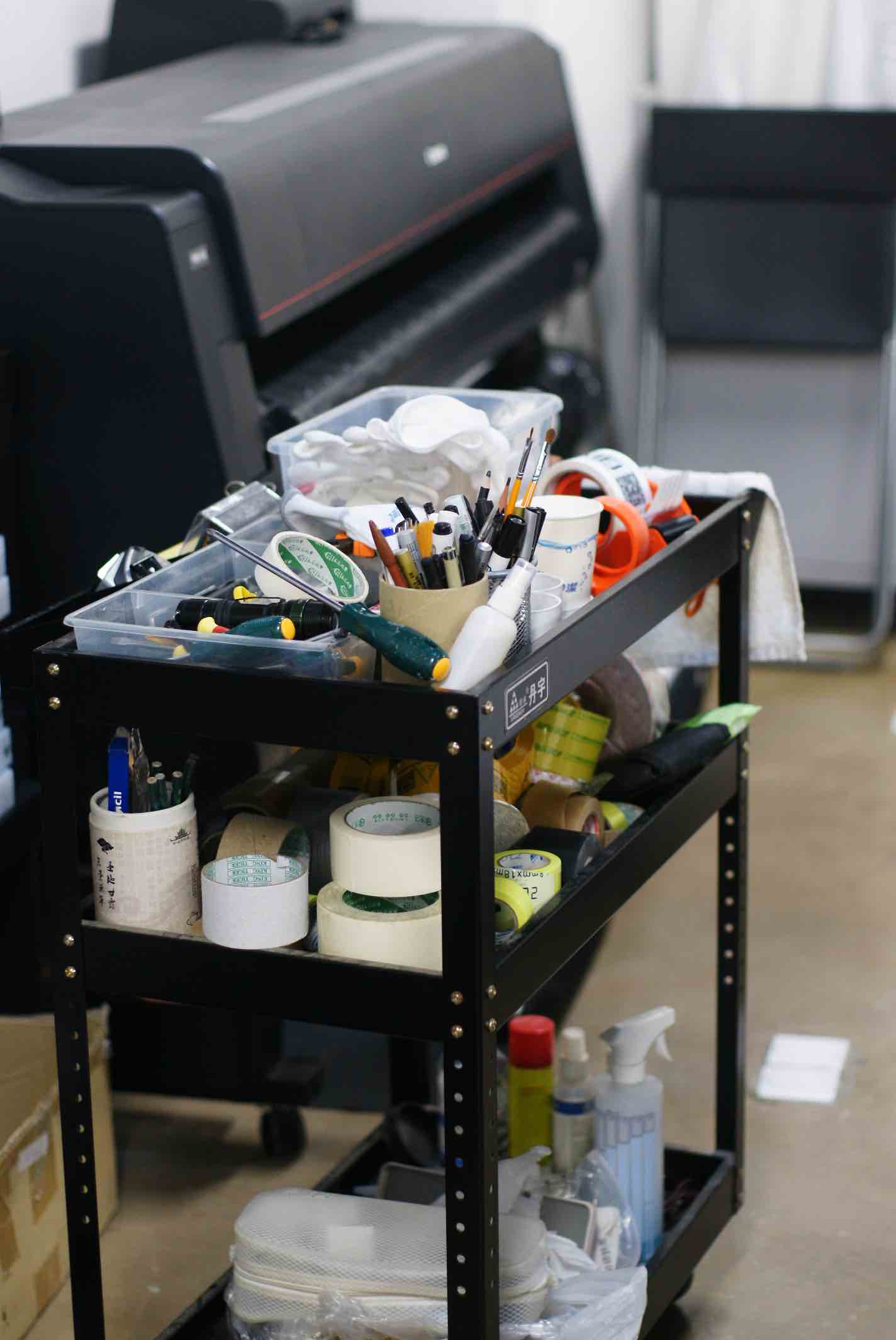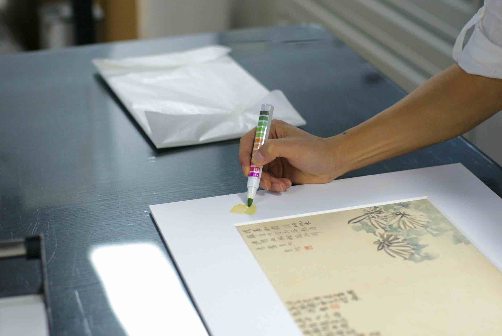 他的工具车里也有很多专业配置,比如可逆固定的点状胶、微循环系统的保护盒,以及纸张酸碱度测试笔,它能帮助他更好地装裱、保护作品和了解新品纸张的酸碱度和耐久特性。