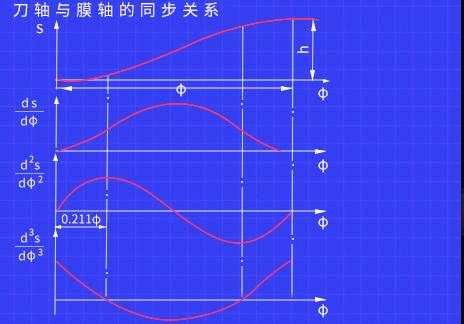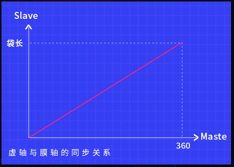 膜轴始终保持匀速运行,主虚轴运转一圈,膜轴运行一个袋长,刀轴也运行一圈。