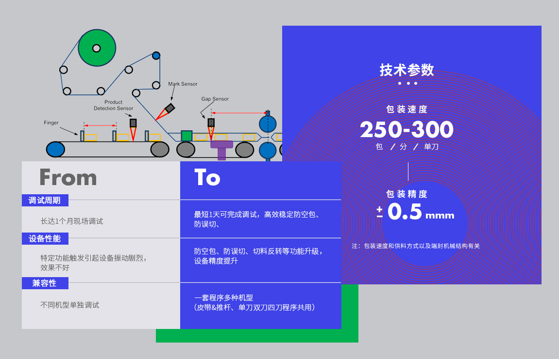 改善后的结果是:防空包、防误切、切料反转等功能升级,设备精度提高。