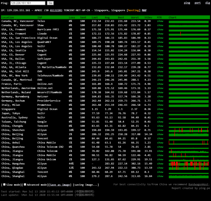 最快新加坡1ms最慢河南郑州[多线]256ms平均108.1ms,新加坡这个速度还是可以接受的