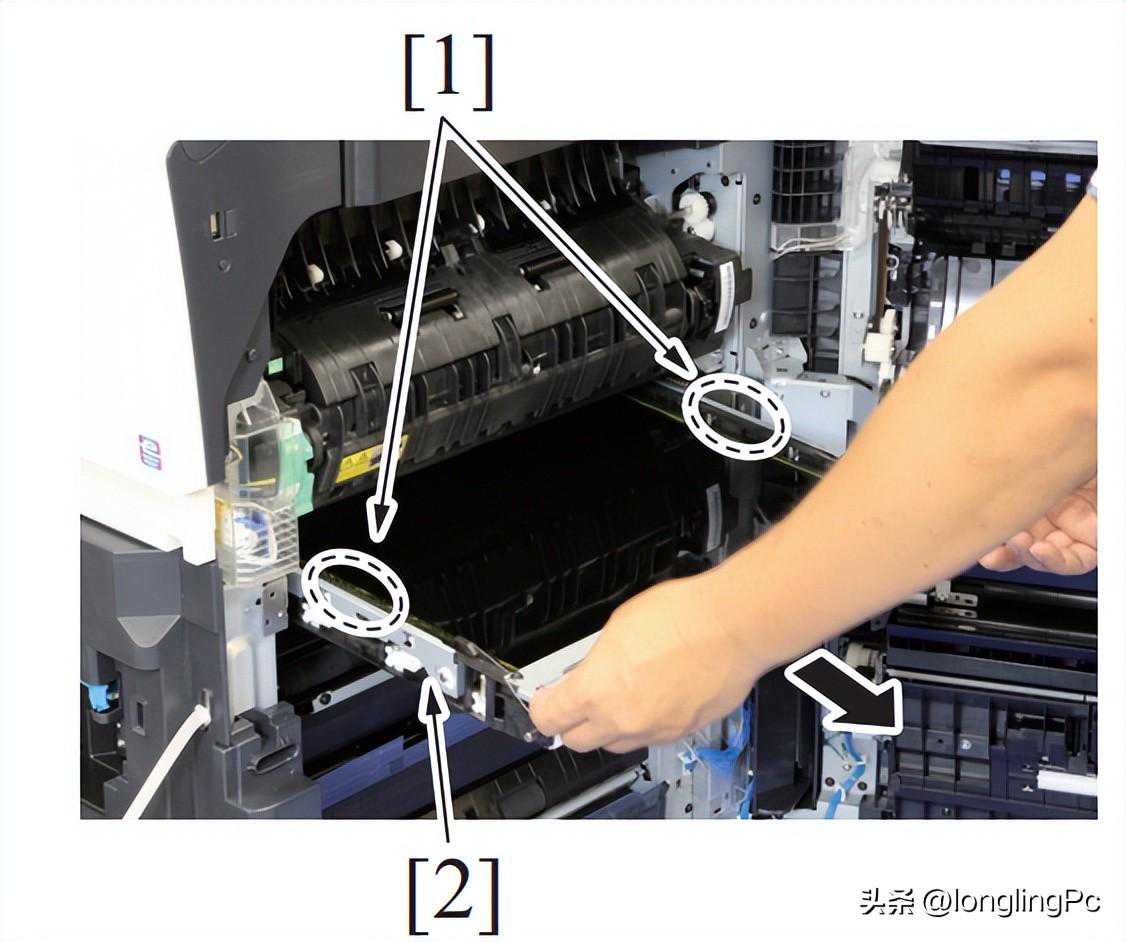 1.拆下废碳粉盒.打开前门--松开废碳粉盒固定杆[1]--并拆下废碳粉盒[2].