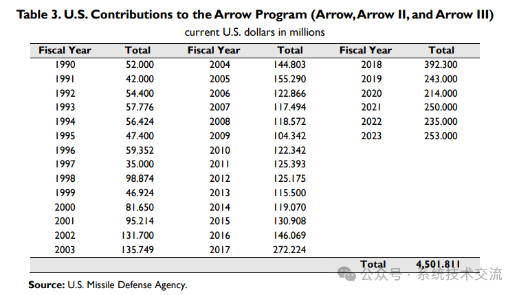 从箭反道系统设计之初,美国就直接为其提供资金。该项目所需的估计信用额度为16亿美元,每枚箭导弹的价格估计为3百万美元。然而,根据美国国会研究服务处(CRS)2023年公布的财务报告,美国对箭反弹道系统的财政援助总额达到45亿美元。