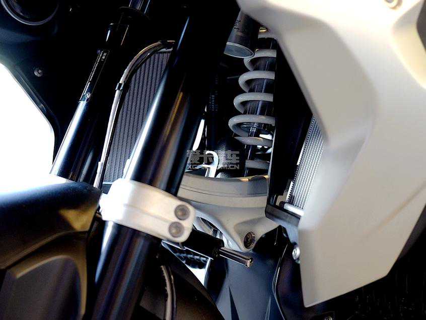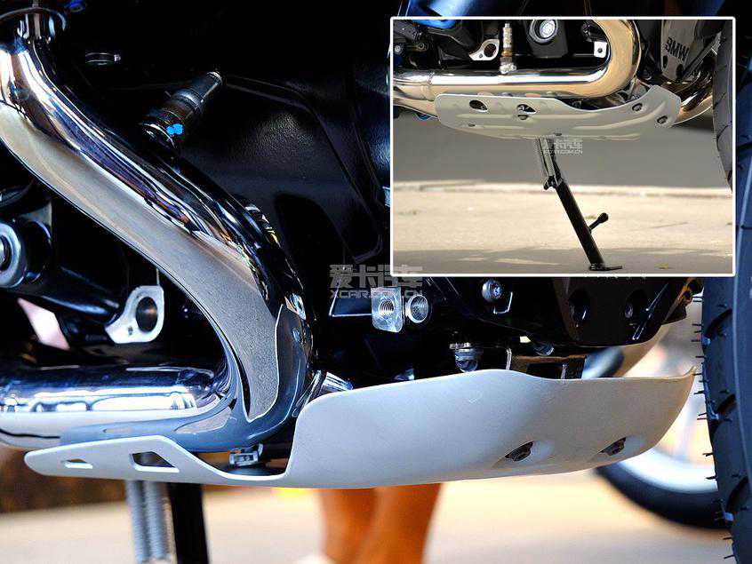 发动机护板是R1250GS的标配,相比老款车型保护更加充分,虽然面积没有明显增加,但可以发现排气前段得到了更好的保护。
