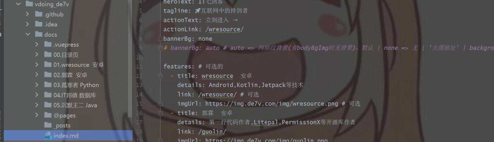 以下字段对应相关的图,可以自行体会一下,对应导航栏下面的几个字段,其中涉及使用URL引入的,可以替换成路径引用,具体字段帮助请自行查看fork过来的仓库介绍,也可以到Vdoing官方文档查阅.