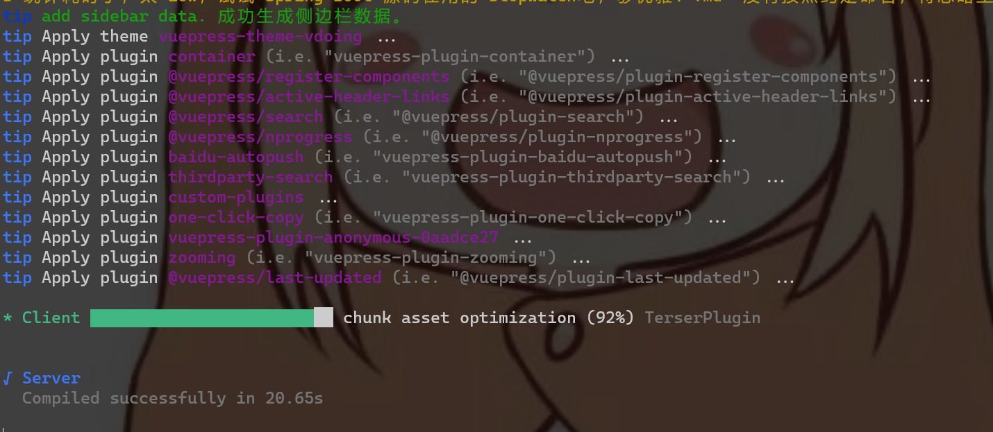 接下来就是稍微有点长的构建时间,大概10分钟吧,主要是Vdoing作者的文章比较多,构建需要花一定时间。