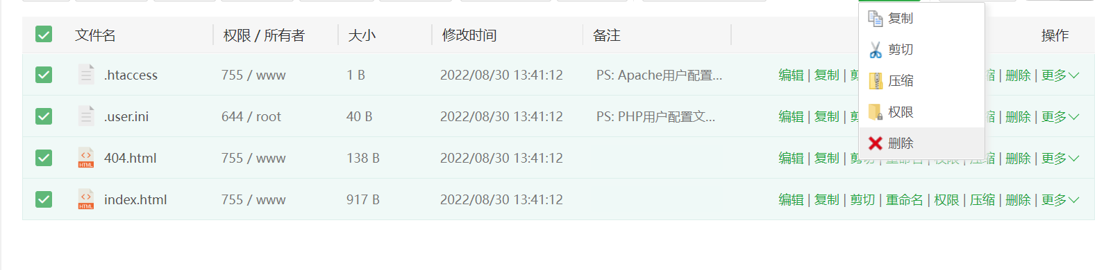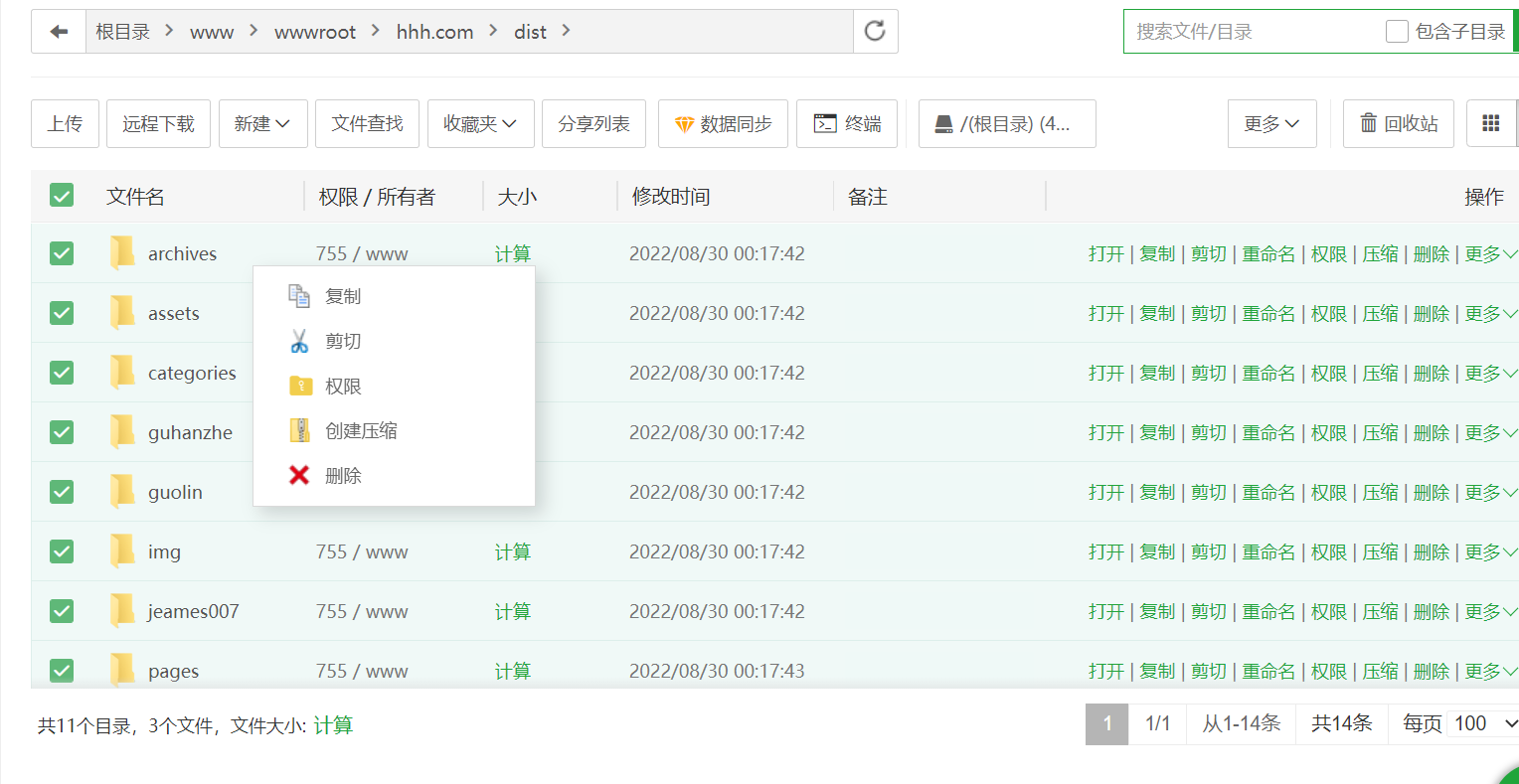 将解压后的文件复制到网站最开始的目录下,并删去原来的dist和文件