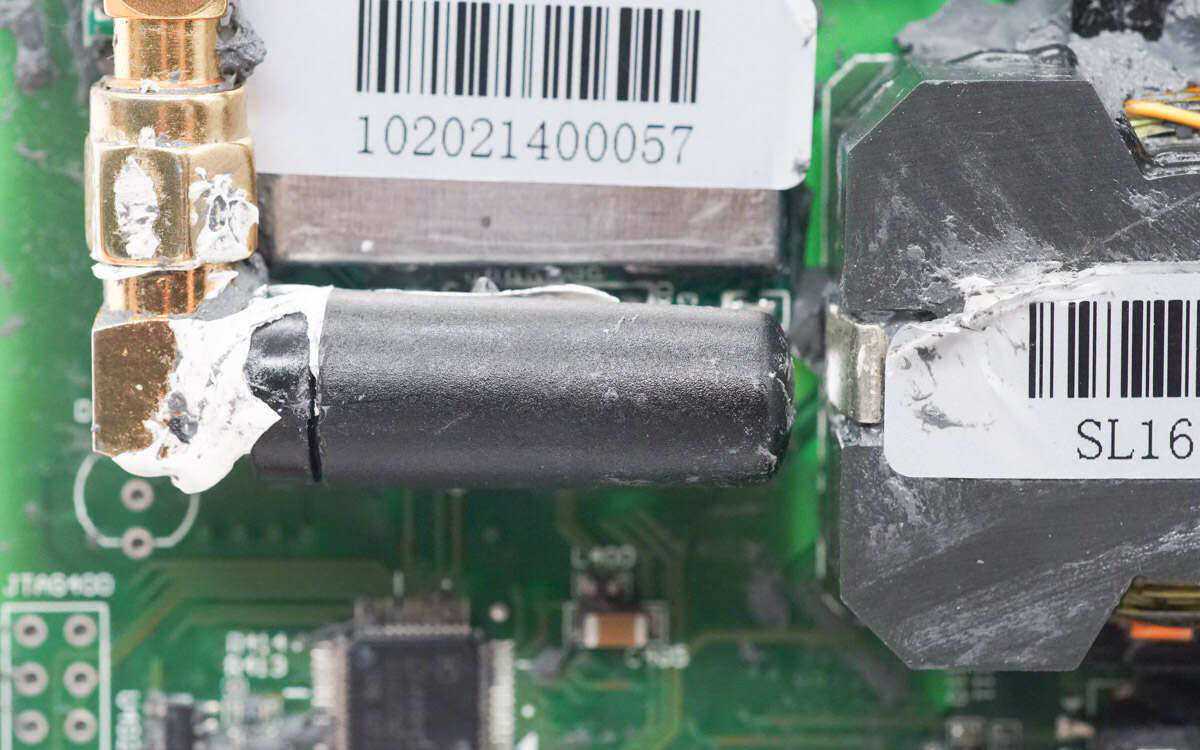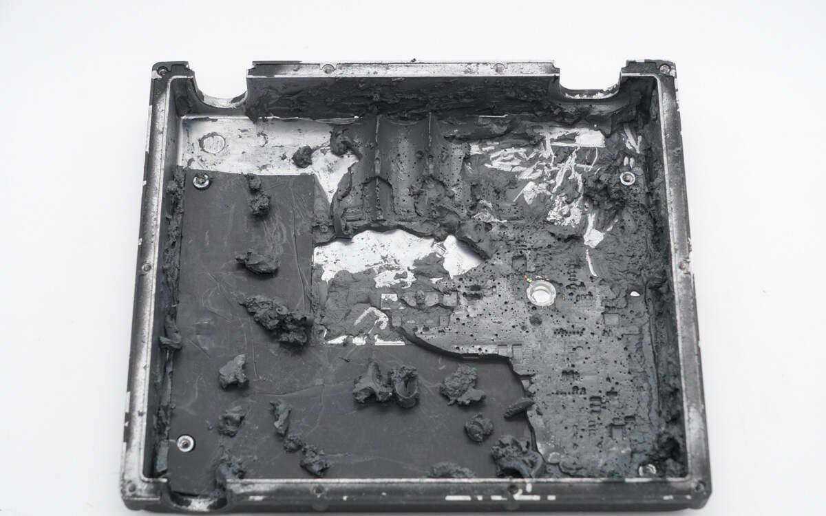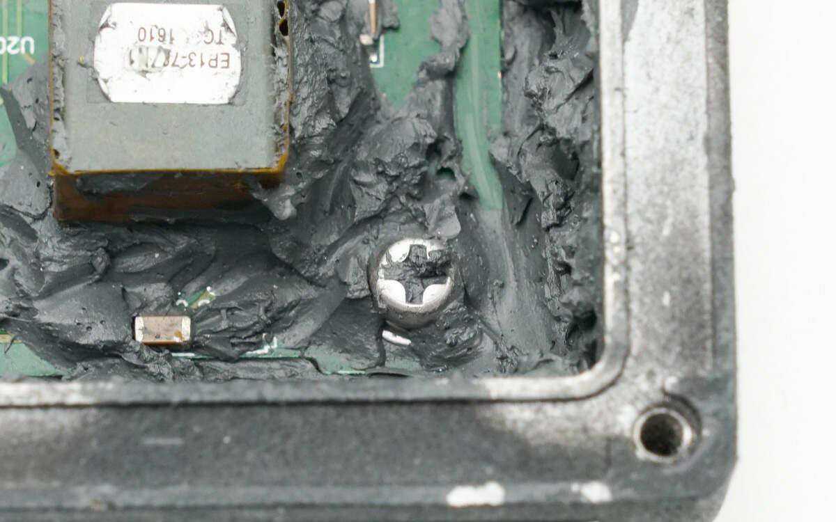 并使用多颗螺丝进行固定。内部填充了导热胶,通过铝合金外壳进行被动散热。
