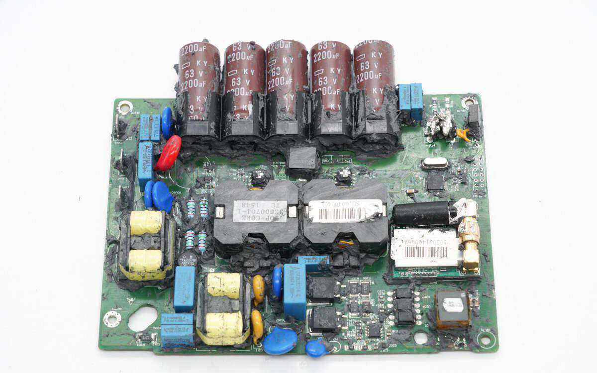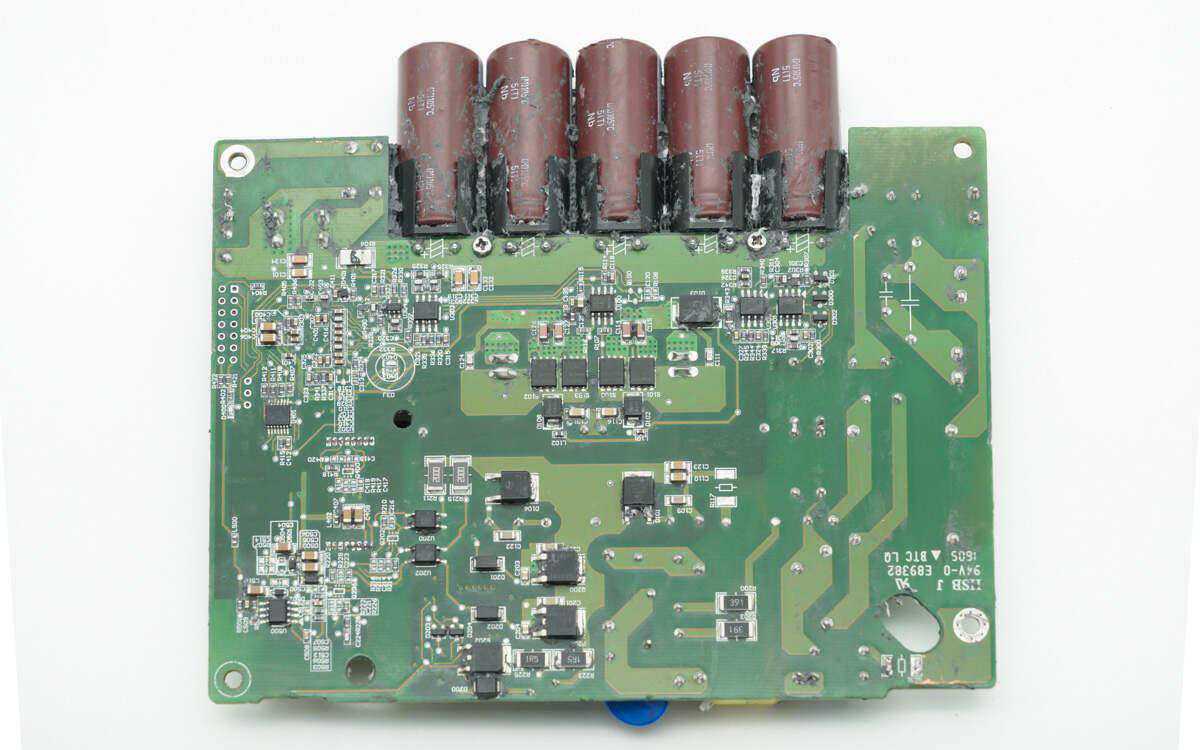 在PCBA模块的正面,有五颗输入滤波电容,它们通过塑料支架固定。