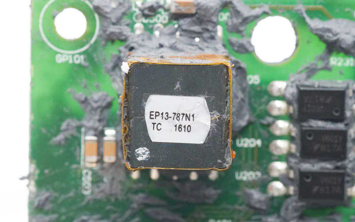 底部有两颗焊接的升压变压器,左侧是输出滤波电路,