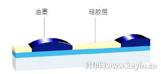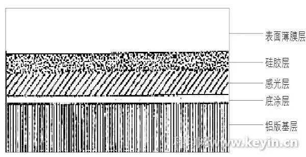 无水胶印印版是采用硅胶来代替润版液,利用其低表面能来排斥油墨。无水胶印印版(包括无水胶印CTP版)由铝版基层、底涂层、感光层、硅胶层和表面薄膜层组成(如图1所示)。