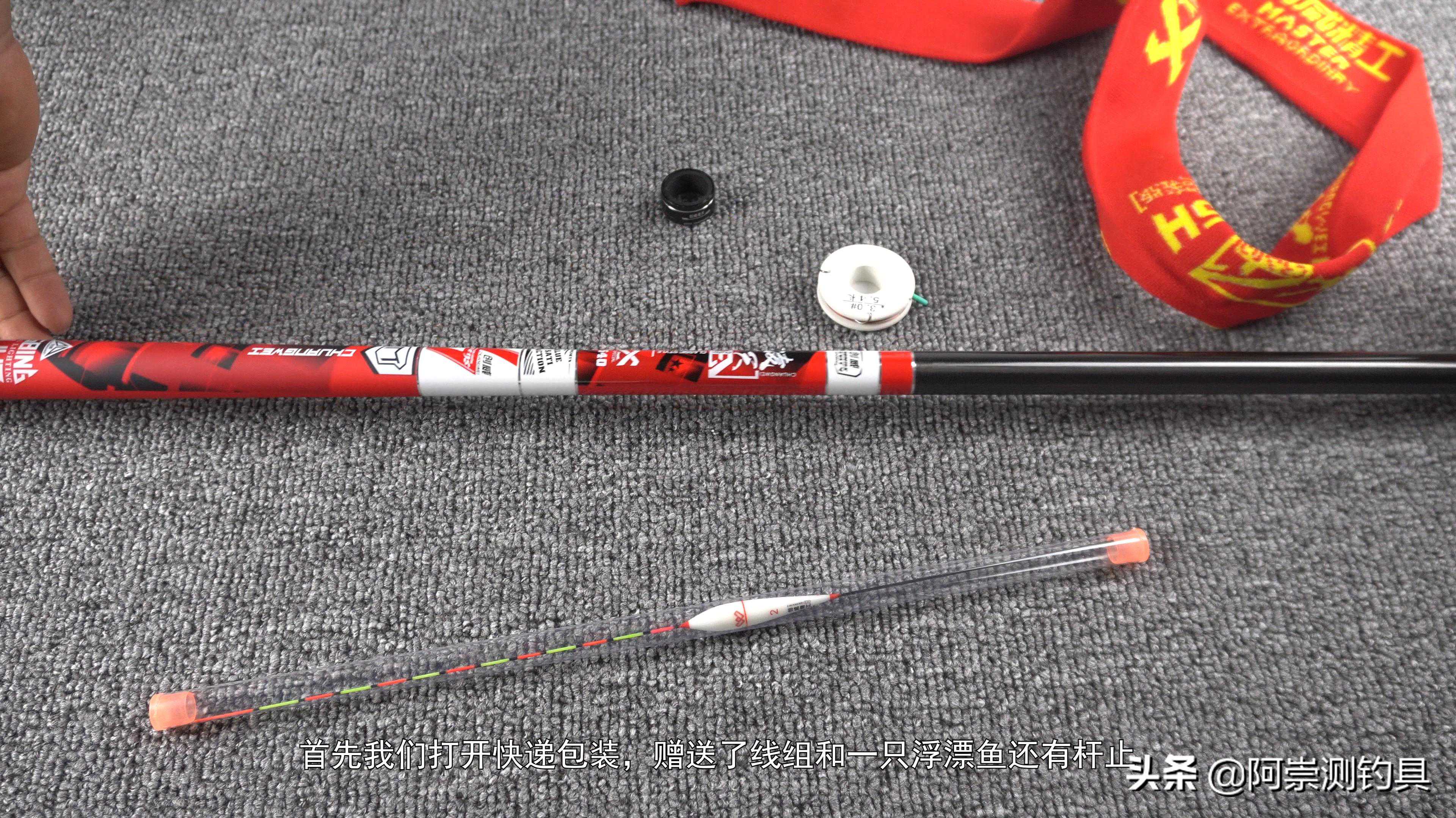 首先我们打开快递包装,赠送了线组和一只浮漂鱼还有杆止.