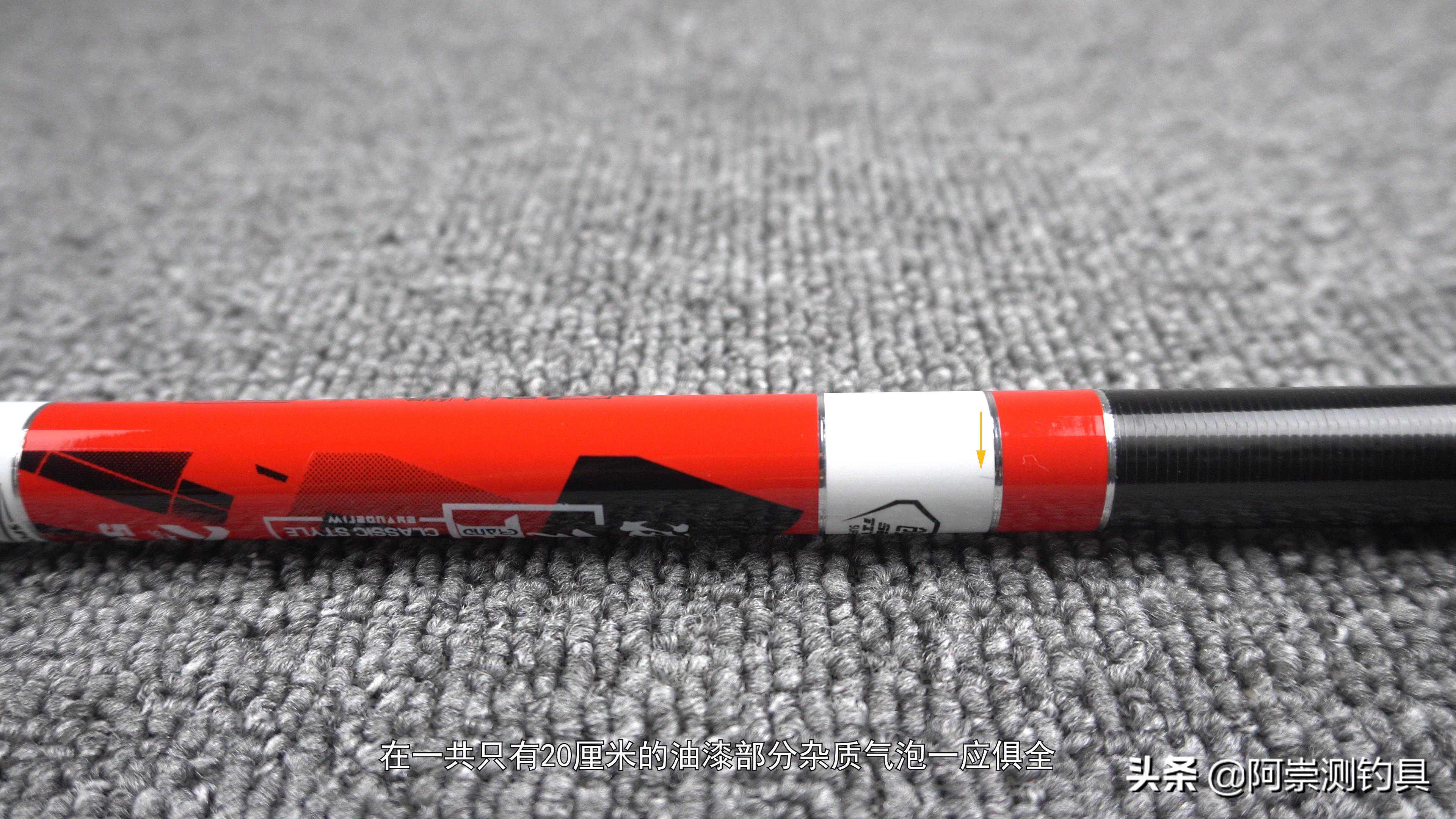 那先看鱼竿,涂装黑白红三颜色搭配,使用银色CP条分割。EVA亲肤涂层握持手把,白色文字和印贴处有凸起感。在一共只有20厘米的油漆部分杂质气泡一应俱全。