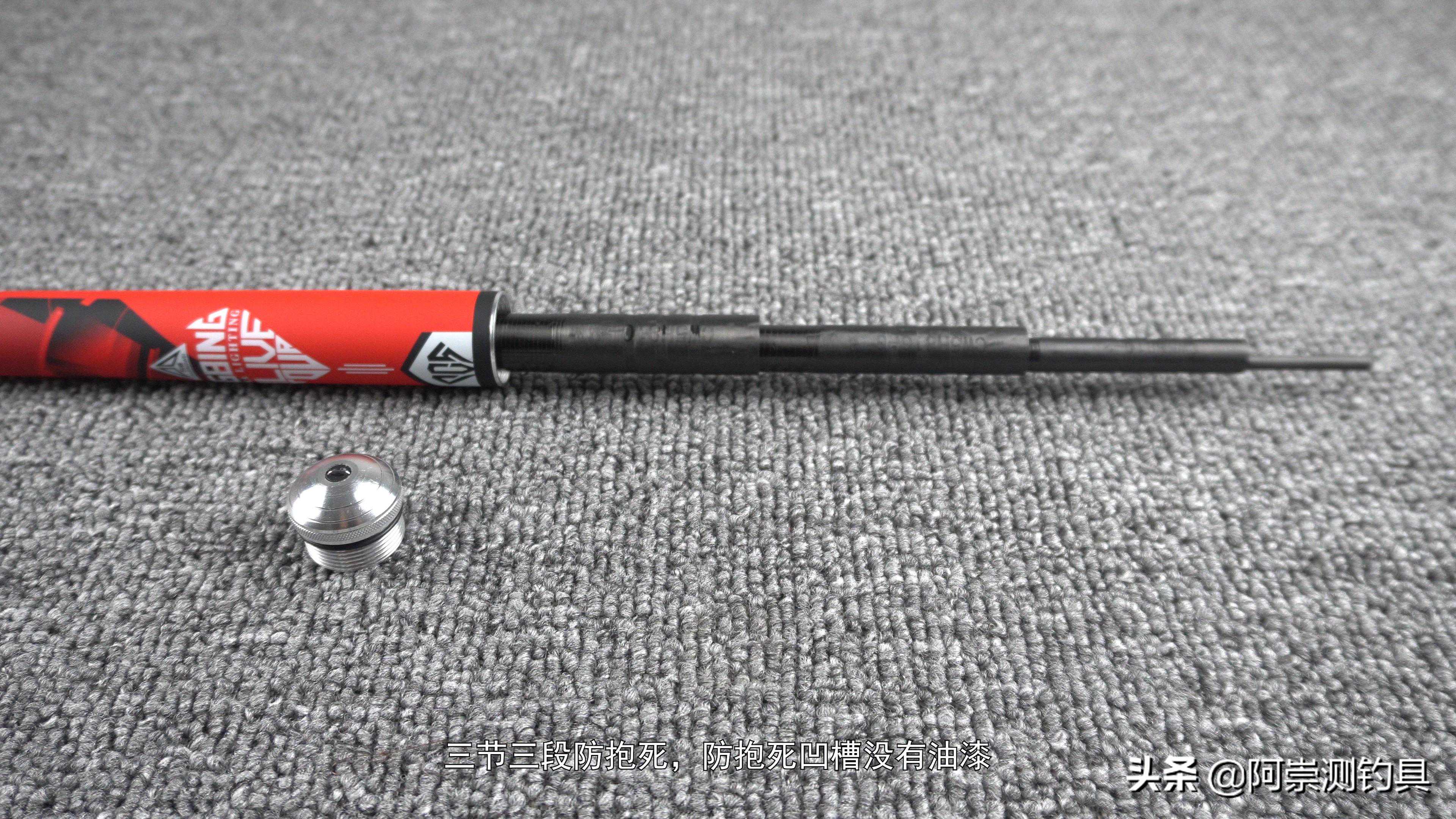 后堵隐藏式失手环,三节三段防抱死,防抱死凹槽没有油漆,杆节附带编码。