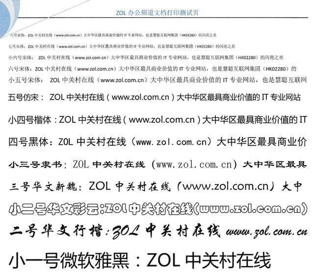 佳能G6080加墨式商用一体机打印不同字体和字号的文本测试页,小至八号宋体自仍然清晰辨识,笔画无断线;字迹清晰、笔画锐利,墨迹无洇染,阅读感良好。显示出很高的黑白文字打印质量。