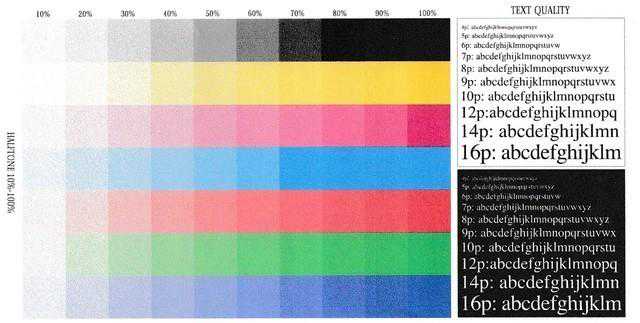 打印KDY样张节选局部分析,半色调区分明确,具备良好的色彩表现力;白底和反相英文字母部分同样打印清晰,白底小至5p、黑底小至6p字母清晰锐利,黑色背景与字母笔画留白边界明确,墨迹无洇染,同样显示出很高的文字打印质量。