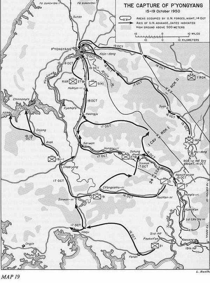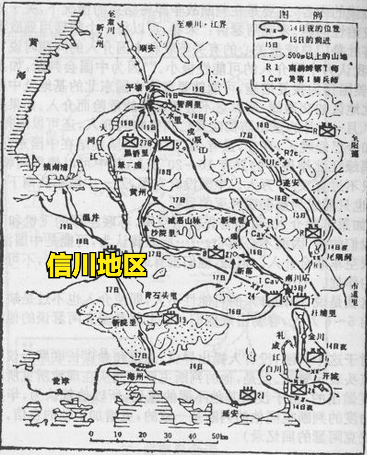 信川郡位于黄海道南部,紧邻载宁江,而根据美军的西线计划和韩军第1师师长白善烨的回忆,负责黄海道载宁江流域军事进攻任务的正是美军第24师。