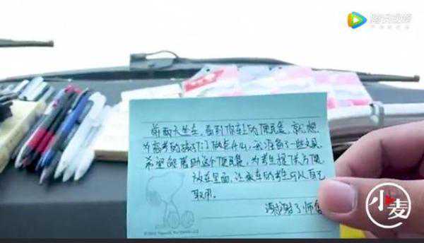 “我替广大考生谢谢这位女士的爱心,我会把所有文具放在便民袋,供考生取用,也预祝所有考生旗开得胜,金榜题名。”