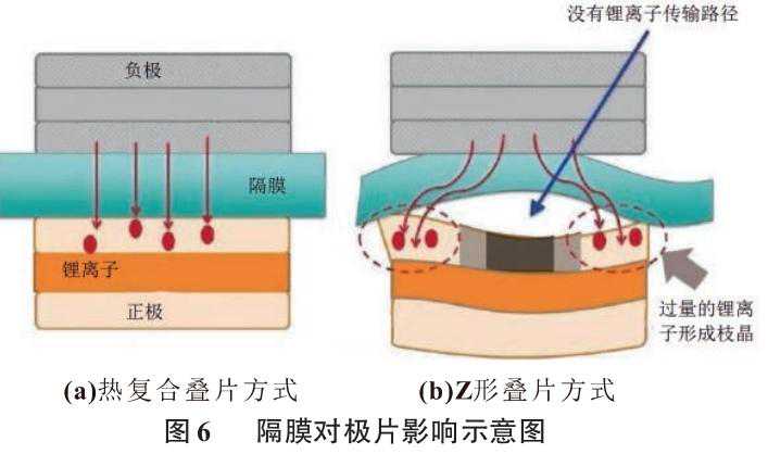 在正极、负极和隔膜进行制片及热压的过程中,隔膜所受的拉力方向始终不变,速度保持均匀,相对于卷绕工艺过程中隔膜受的拉力是不断变化的情况,能有效避免隔膜由于受力不断变化而产生的不均匀延展、褶皱、变形以及隔膜机械性能下降的问题;相对于Z形叠片工艺中隔膜所受拉力周期性变化以及周期性摆动的情况,同样能有效避免隔膜由于受力不均匀且运动速度不平稳而产生的极芯变形和隔膜性能下降的情况,图6(a)为热复合式叠片方式生产极芯的示意图,中间隔膜受单一方向的均匀拉力,平而直,与上下贴合的正、负极片贴合面接触良好;图6(b)为Z形叠片方式生产极芯的示意图,由于中间隔膜受力不断变化且运动方向也在不断改变,因此隔膜与上下贴合的正、负极片贴合面不完整,中间存在空心部分,最终会导致正负极之间离子的路径通道减少,使电池质量下降。热复合式叠片机在生产过程中隔膜连续单方向输送,速度和张力控制稳定,制造出来的极芯界面平整,隔膜的机械性能、孔隙率、平均孔径、极片与隔膜界面等均匀一致,对后续锂离子电池性能的一致性和充放电能力以及循环寿命都有着非常重要的影响。