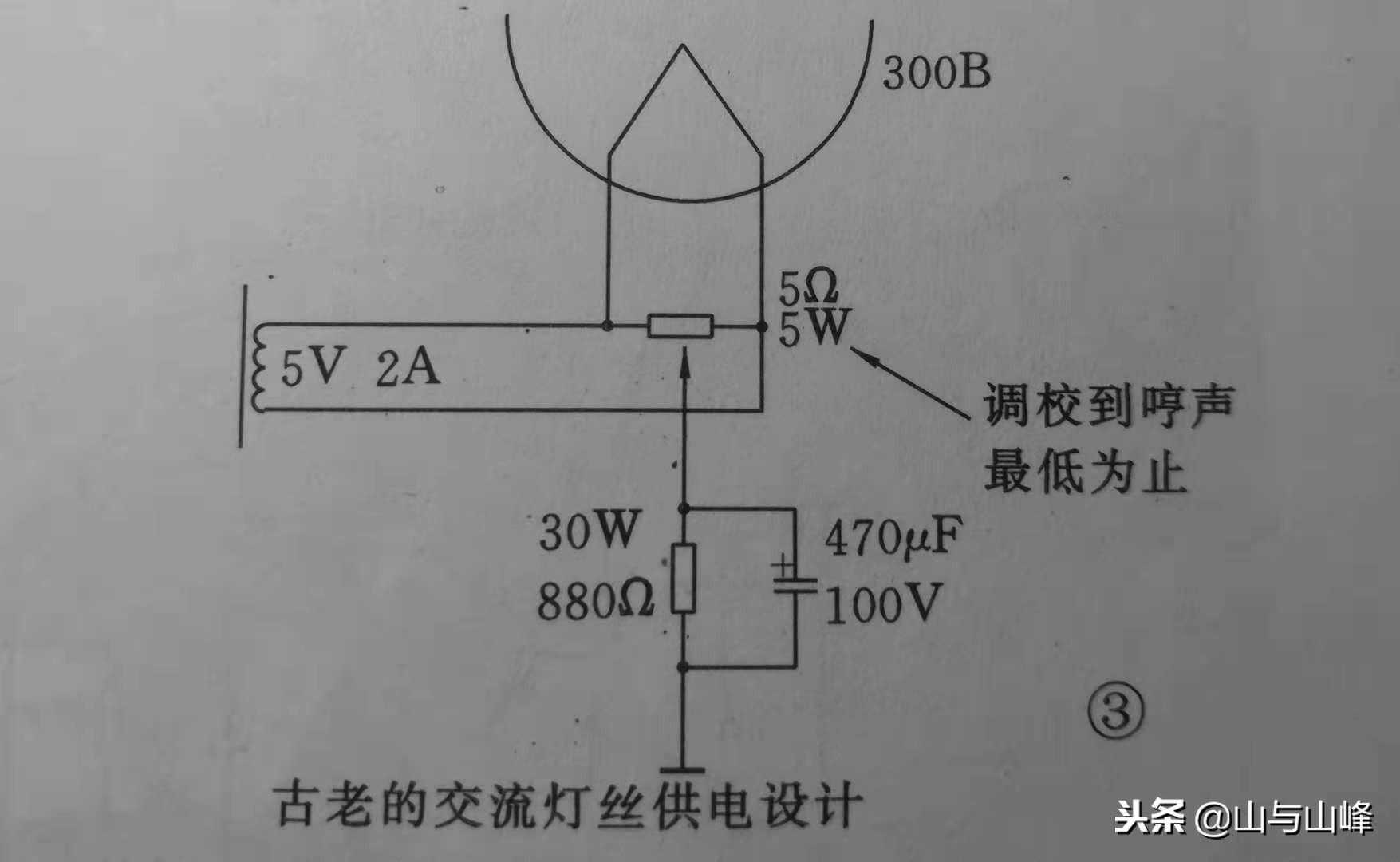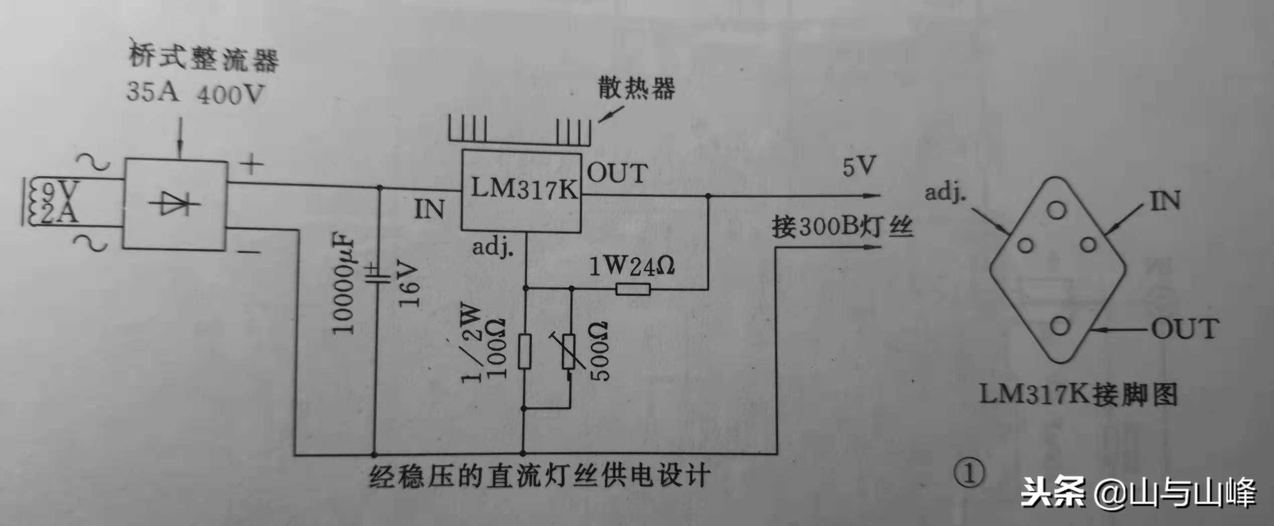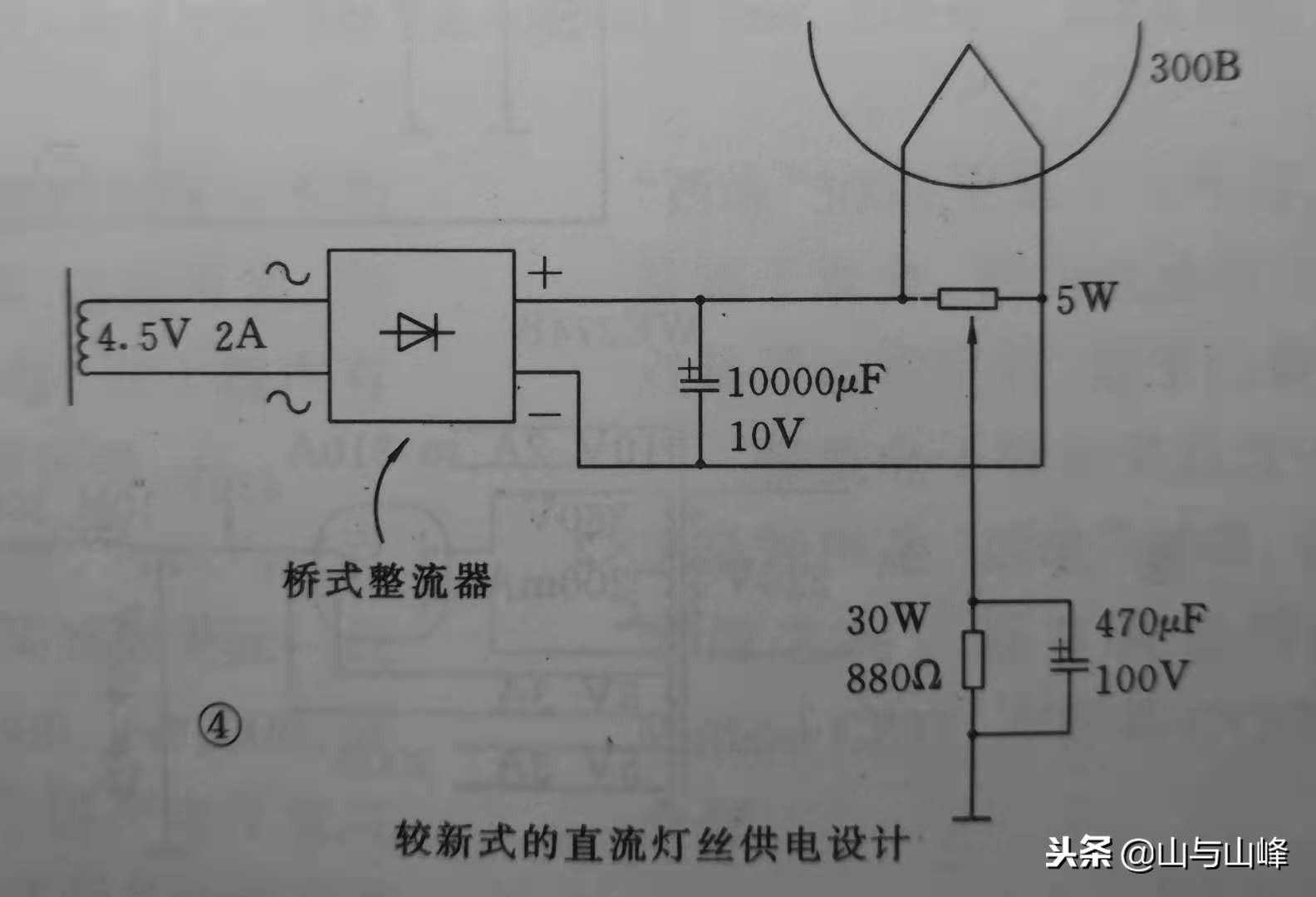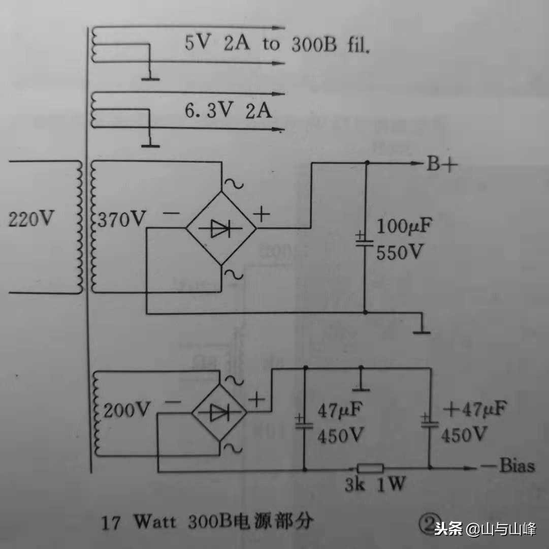 老一代300B的灯丝供电都属于交流供电,这样会听到扬声器有哼声出现,幸好问题不大,属于可容忍程度,一般距离三英尺外都是听不到的。较新的设计都是转用直流供电方式,甚至加上稳压器,使交流成份更低,信号电流更纯净,方法如图所示。