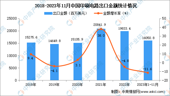 2023年1-11月中国印刷电路出口量及金额增长情况