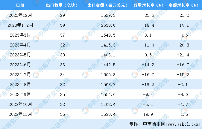 :据中商产业研究院数据库显示,2022年我国印刷电路的出口量小幅下降,降至434亿块,同比减少9.7%。最新数据显示,2023年1-11月中国印刷电路出口量369亿块,同比下降8.8%。