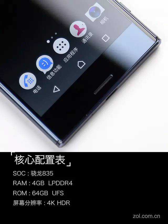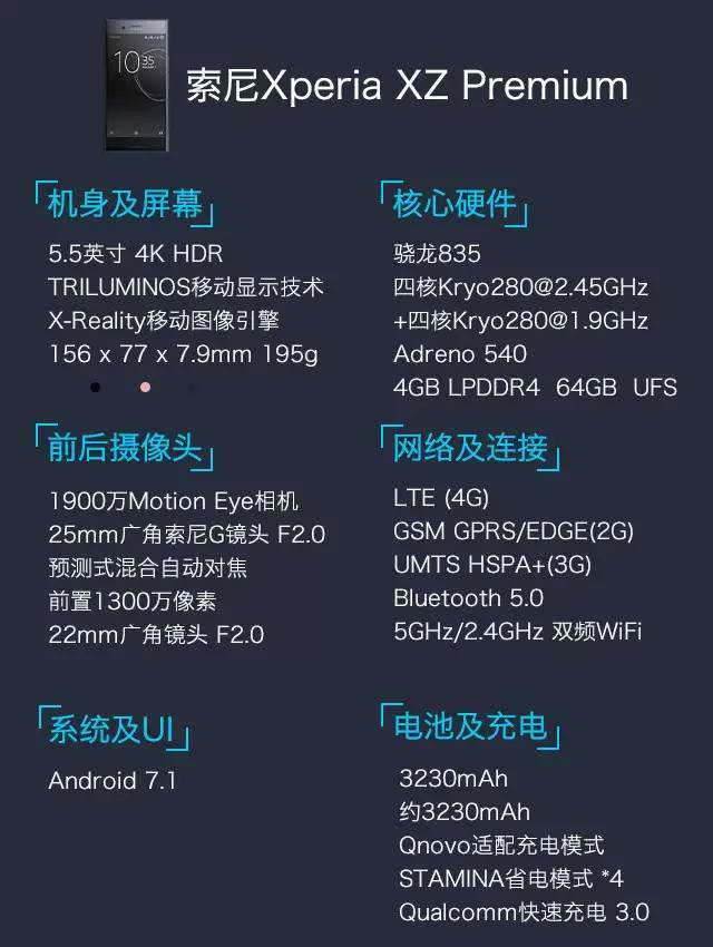 索尼XZpremium搭载骁龙835移动平台,配以4GBRAM+64GBROM,采用5.5英寸屏幕,分辨率高达4K标准(3840*2160),支持索尼特丽魅影技术并双面覆盖康宁第五代大猩猩玻璃,支持IP65/68水准的防尘防水等级,出厂预装系统。电池容量3230毫安时,支持高通技术。