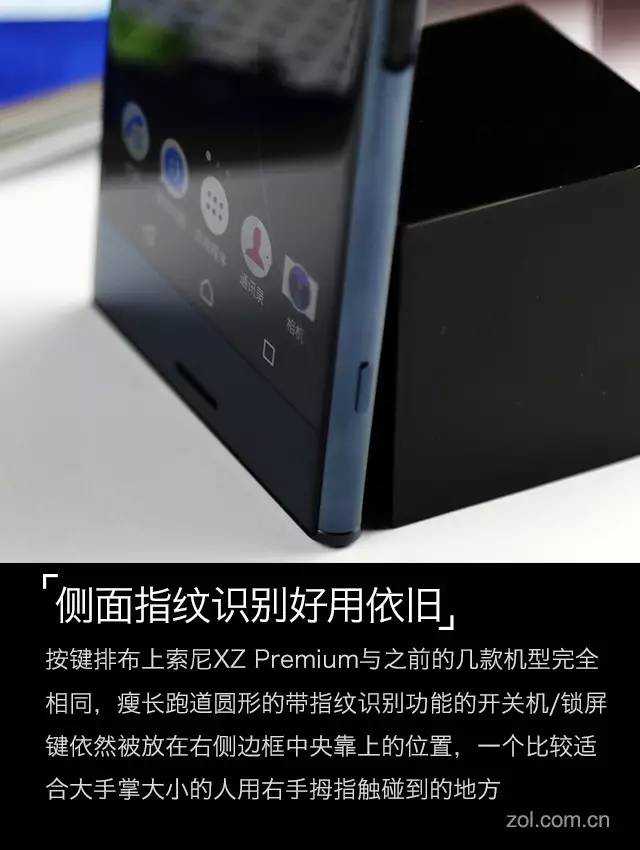 虽然是Z5系列首创,但侧面指纹识别功能在XZPremium上还是值得一提,这几乎是对于大屏手机来说最舒适的姿势,不存在正面靠下的HOME键指纹识别握不稳的问题和后置识别所需要的食指那种对于大多数人并不太容易习惯的方式;指纹识别的速度与准确度可以算是顶级。