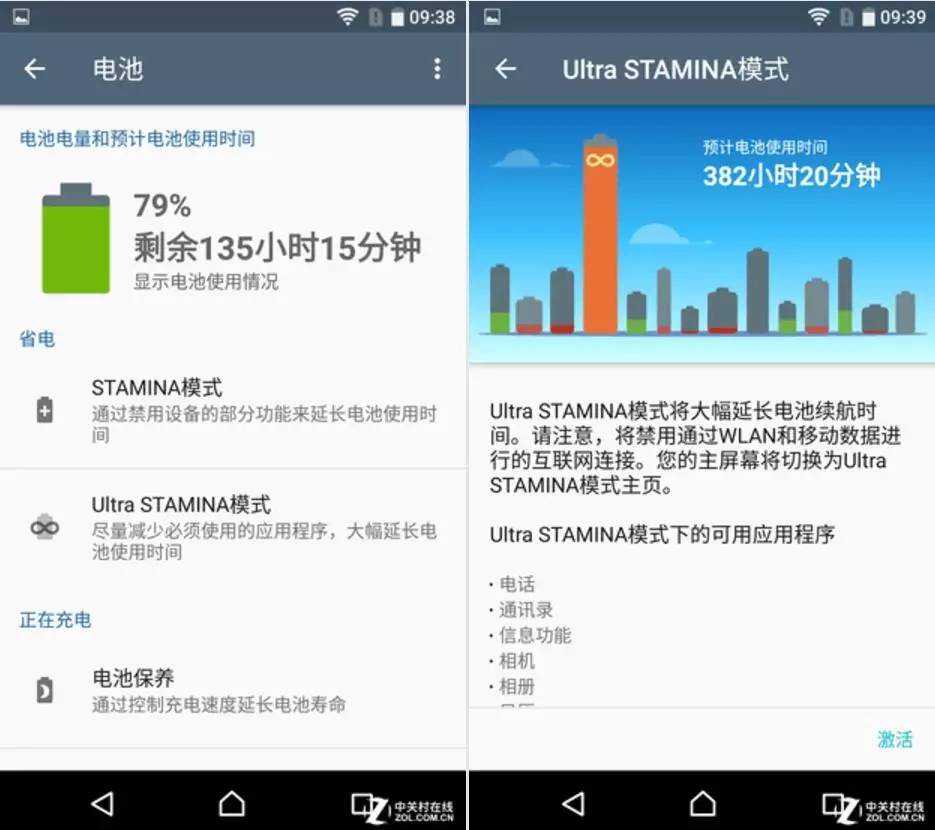 每代的STAMINA策略都小有不同,在XZPremium上面,该模式下可用的功能不仅限于电话这样最基础的功能,还多了通讯录、信息、相册、相机等,相对来说较省电,切换至该模式下的手机也将进入一个简单的功能界面,仅有上面提到的几项功能而且不能通过抽屉菜单进入其他功能。