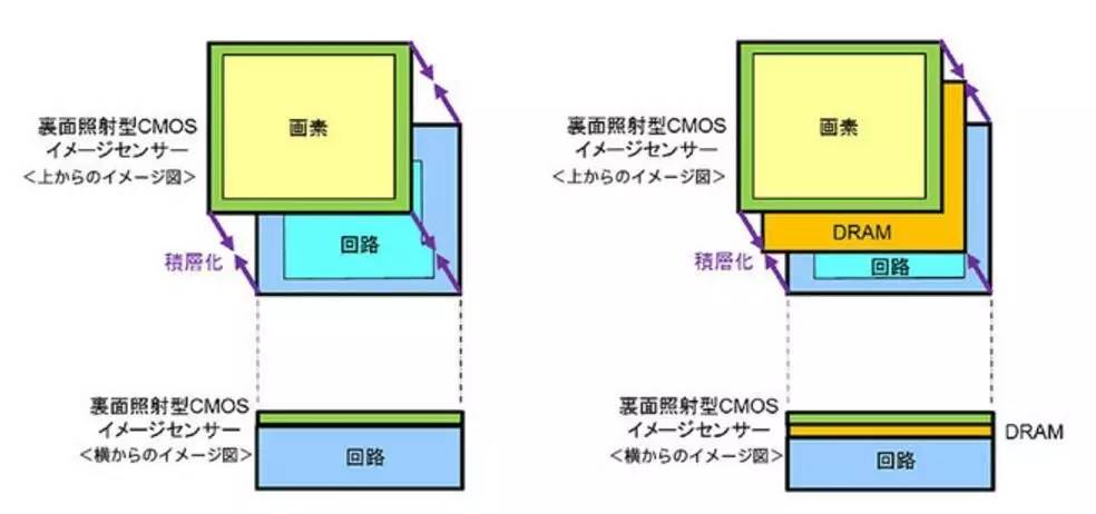 堆栈式CMOS(左)与加入DRAM层的三层堆栈式CMOSIMX400