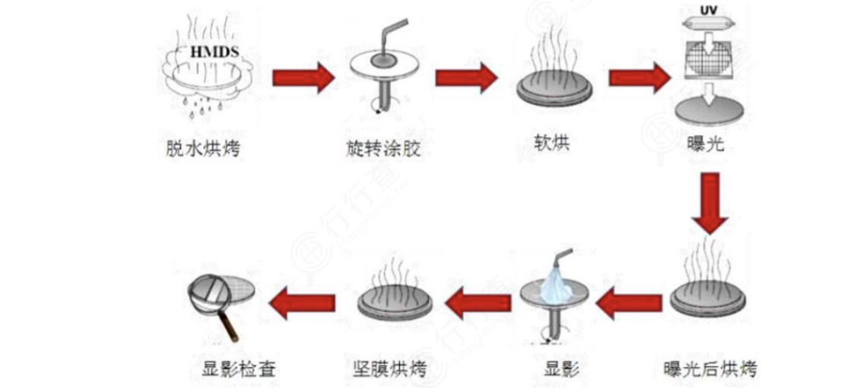 光刻工序是集成电路制造中的核心步骤,其将掩膜版上的电路图形转移到硅片,八个环节分别为脱水烘烤、旋转涂胶、软烘、曝光、曝光后烘烤、显影、坚膜烘烤、显影检查,而涂胶显影设备是光刻工序中与光刻机配套使用的涂胶、烘烤及显影设备,包括涂胶机、喷胶机和显影机。